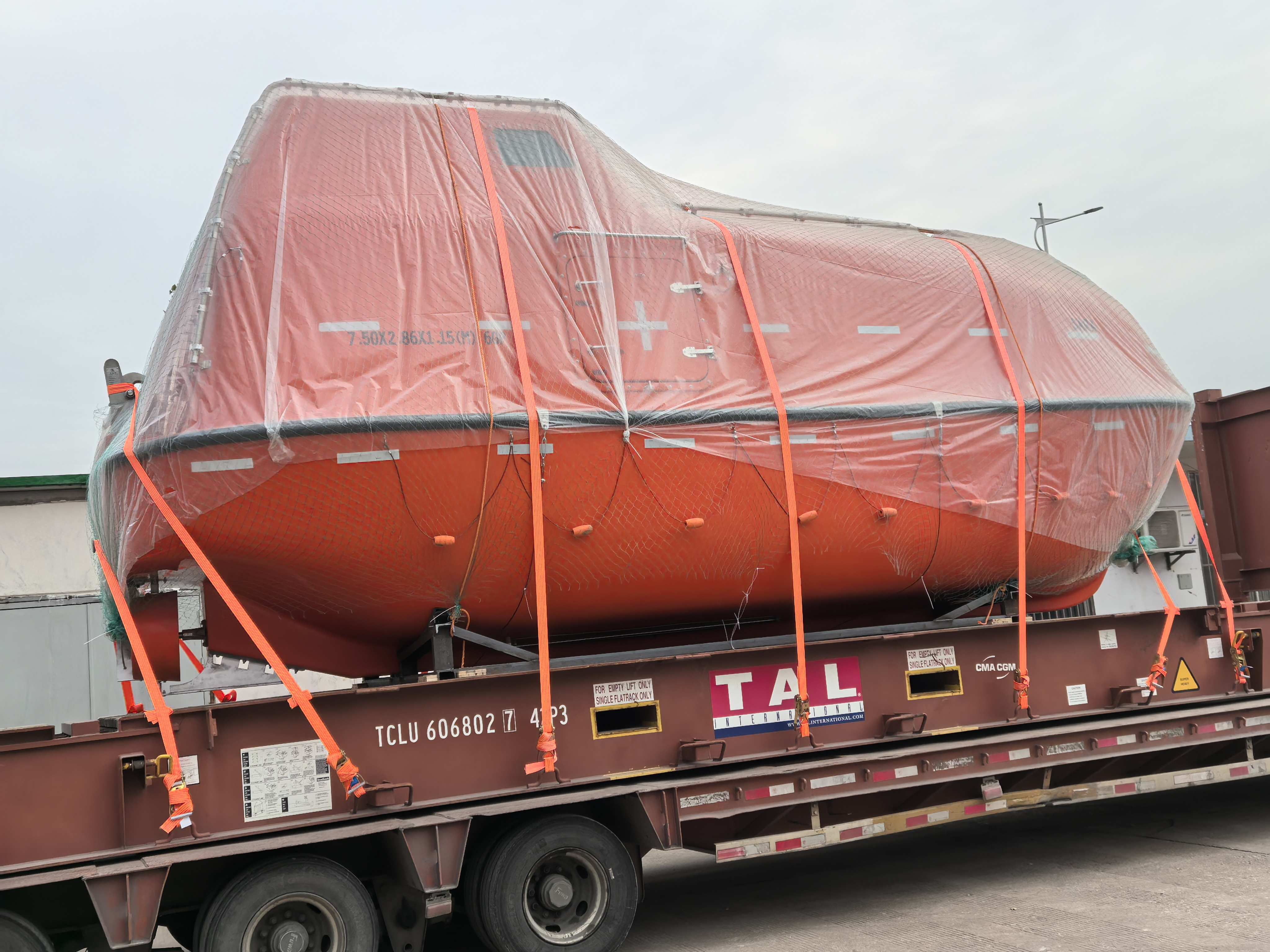 Zhenjiang matchau marine equipment co.,ltd. deliver a 60 persons fire protected type totally enclosed lifeboat for a new ship project, the lifeboat main dimension is 7.5x2.86x3.2m with zhenjiang siyang engine 380J-3 disel engine.